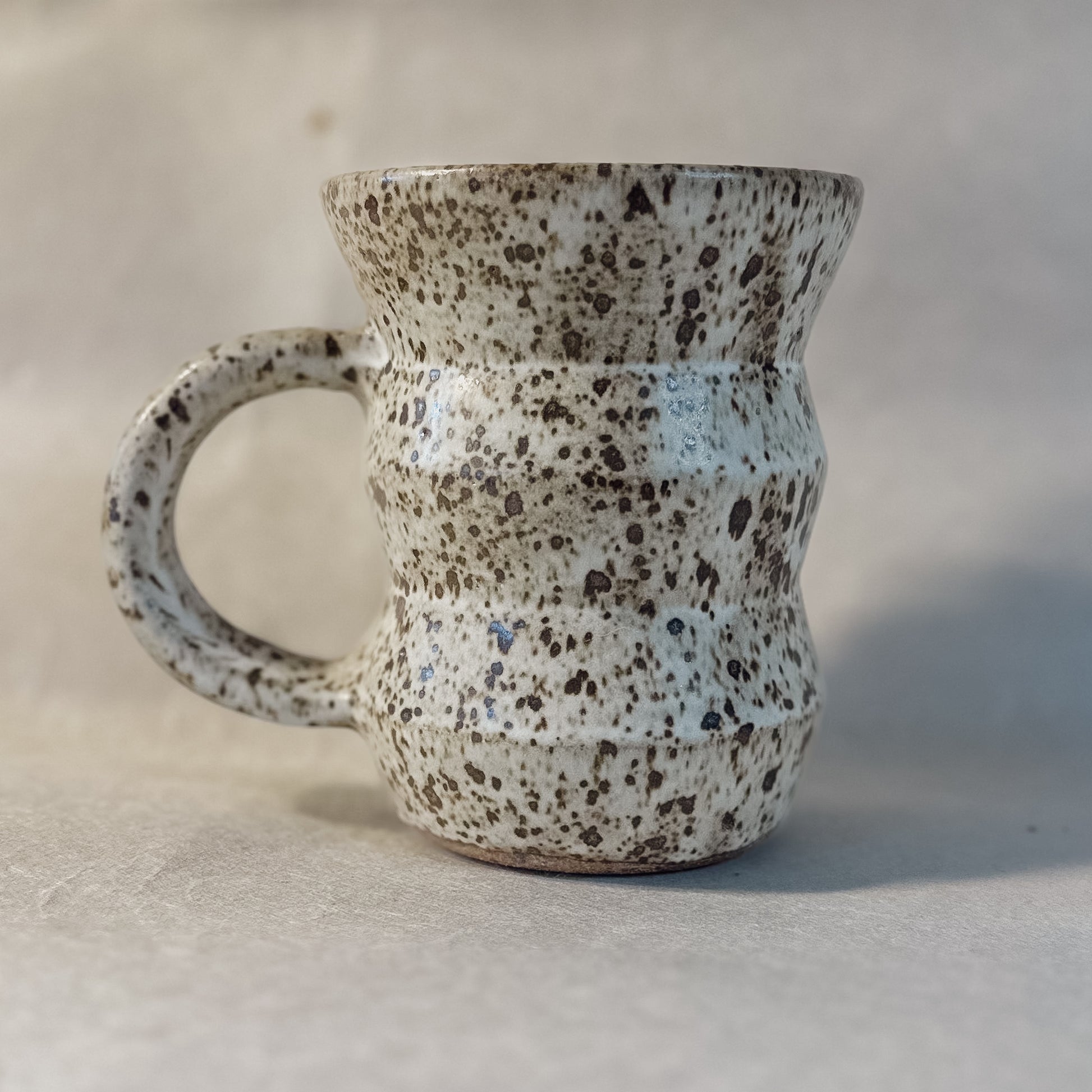 The angled mug fits in your hand perfectly whether you like to grasp from the handle or cup with both hands using the angled groove. Measure about 4.25 x 4". Food safe, hand wash recommended.