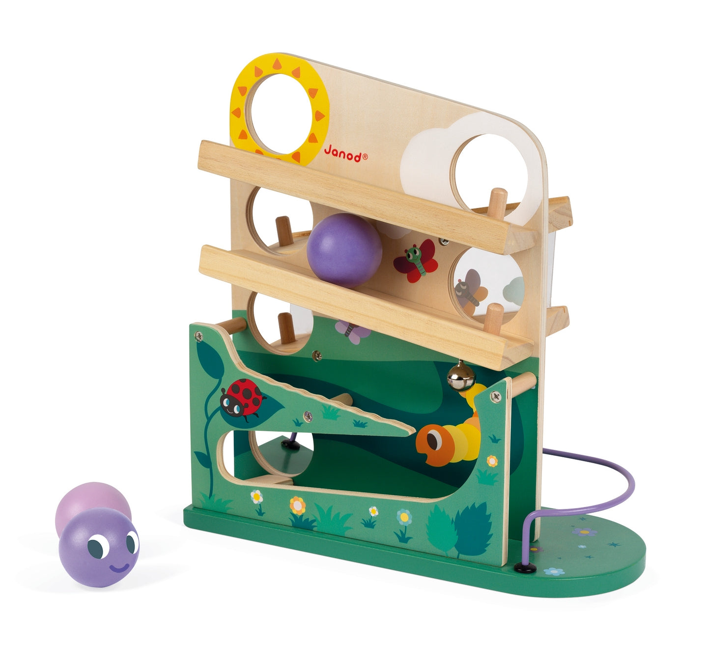 The 3 balls pass through the sun and the clouds, and then through the clear tunnel, ring the little bell, and then go into the garden to form a caterpillar. Children will develop visual acuity by following the movement.
