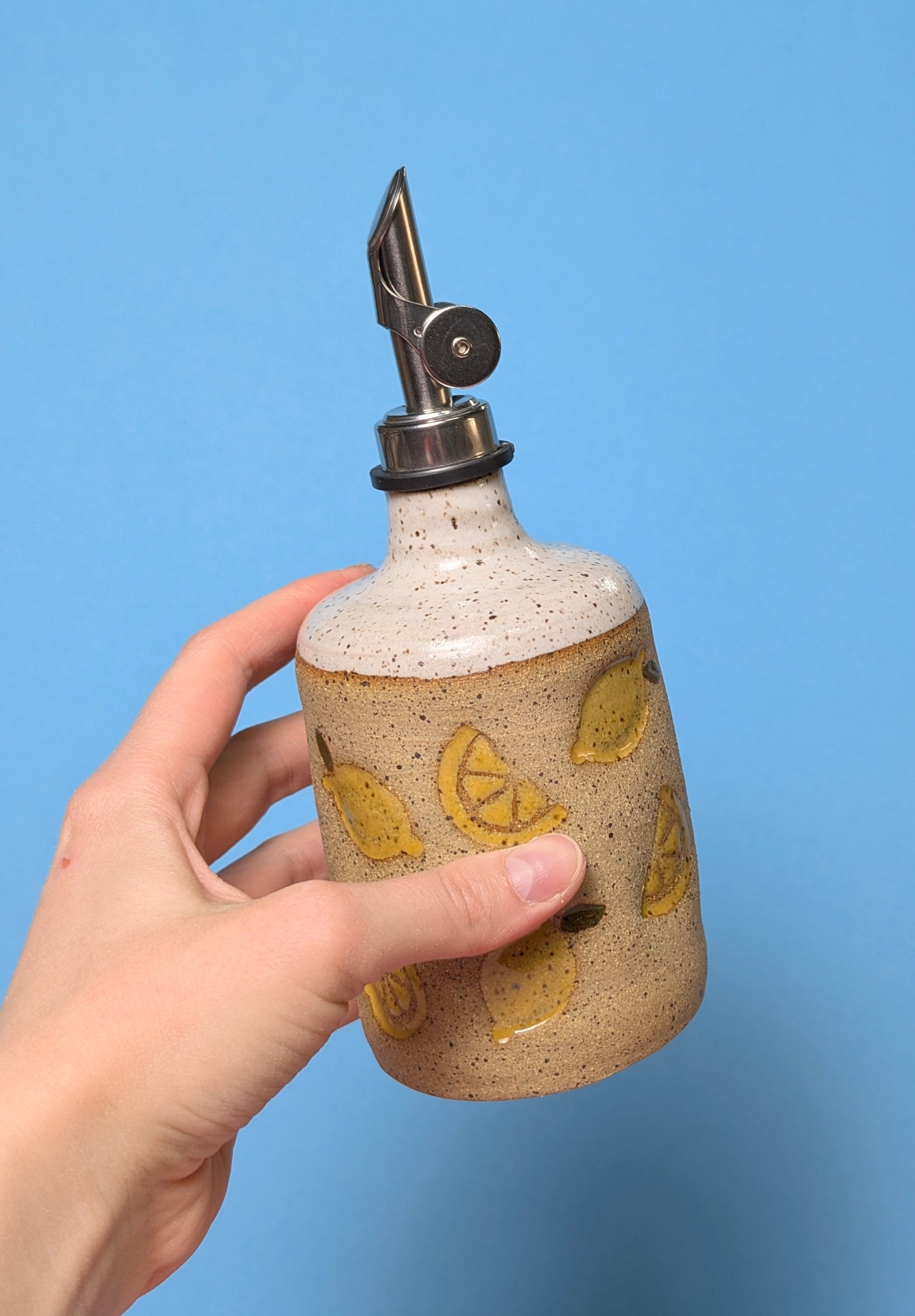 Handmade ceramic oil cruet, thrown on the wheel and stamped with a handmade stamp.The lemons are glazed a light buttery yellow and the rest of the cruet is the raw speckled brown clay. Made for use with olive or other oils, each oil cruet comes equipped with a stainless steel and rubber pour spout.