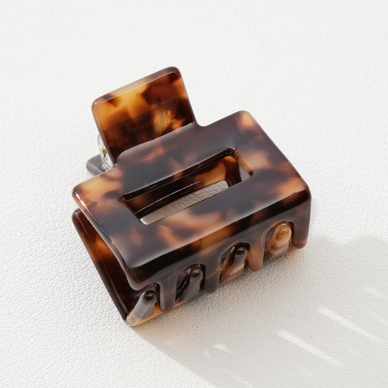 A high-gloss blend of deep amber and espresso brown, this 1.5 inch claw clip will hold short/fine hair as well as half ups. Made with eco-friendly cellulose acetate that is both durable and comfortable.