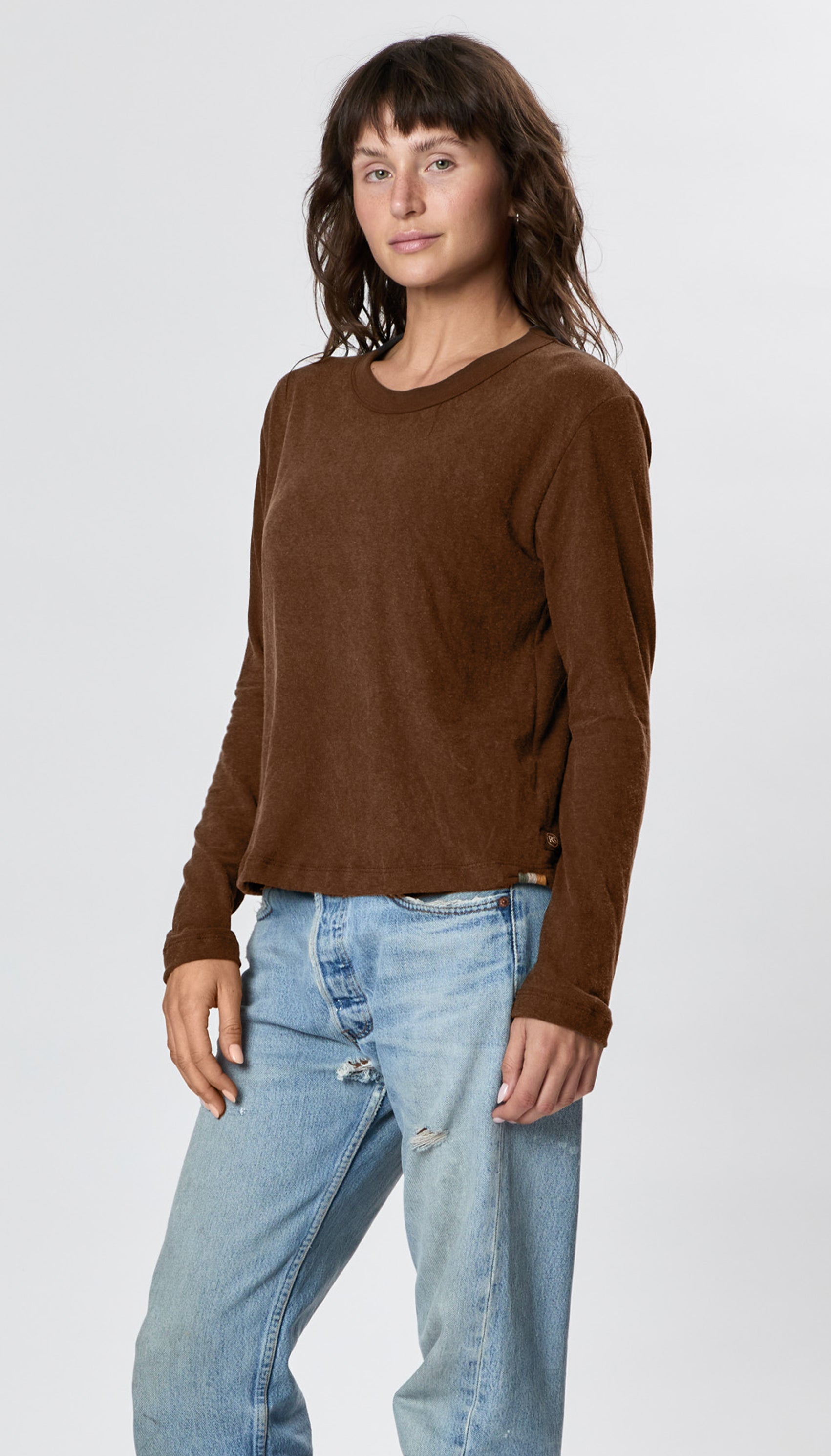 The perfect staple long sleeve with a luxurious drape. Its loose, boxy fit and vintage bound neck add a cool factor. Striking the perfect balance between a relaxed, boxy silhouette and a flattering length complements any body shape. Crafted from 55% Hemp and 45% Organic Cotton Jersey, it's durable, hypoallergenic, and gets better with time.