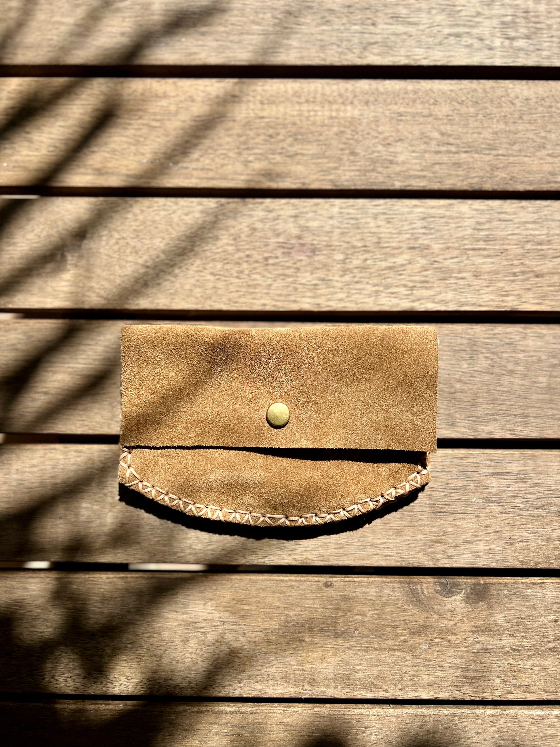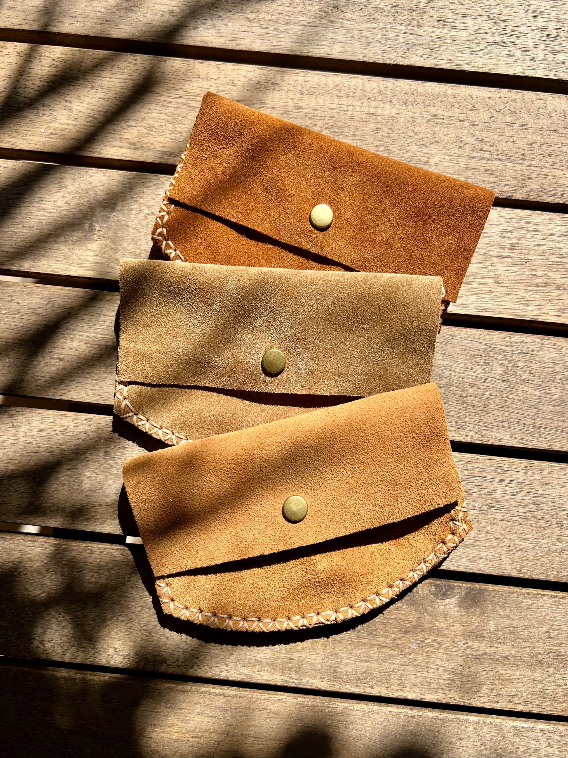 These hand stitched suede wallets have two pockets with lots of space, with an antique brass snap closure.