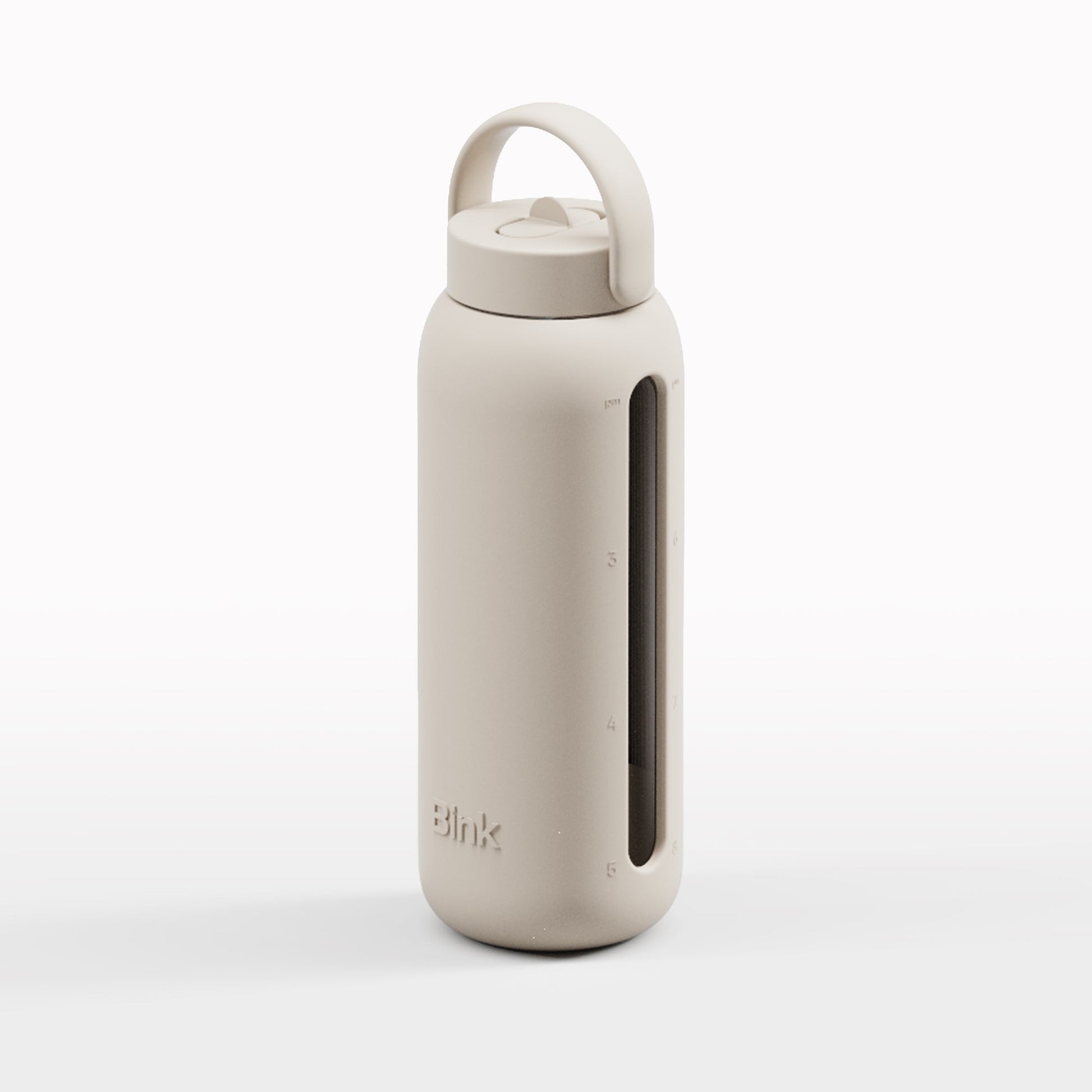 A simple glass water bottle with an integrated flip cap. Features hydration tracking designed to help you meet your daily recommended water needs. Because your health is your greatest asset, and drinking enough water should never feel abstract or unattainable.